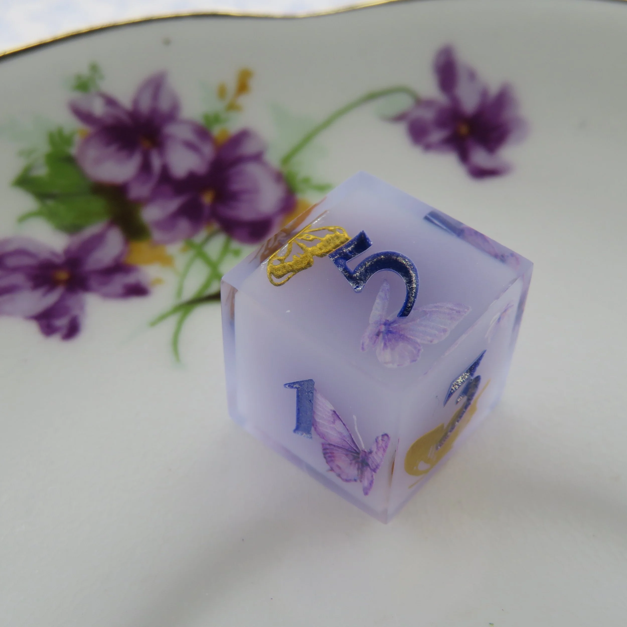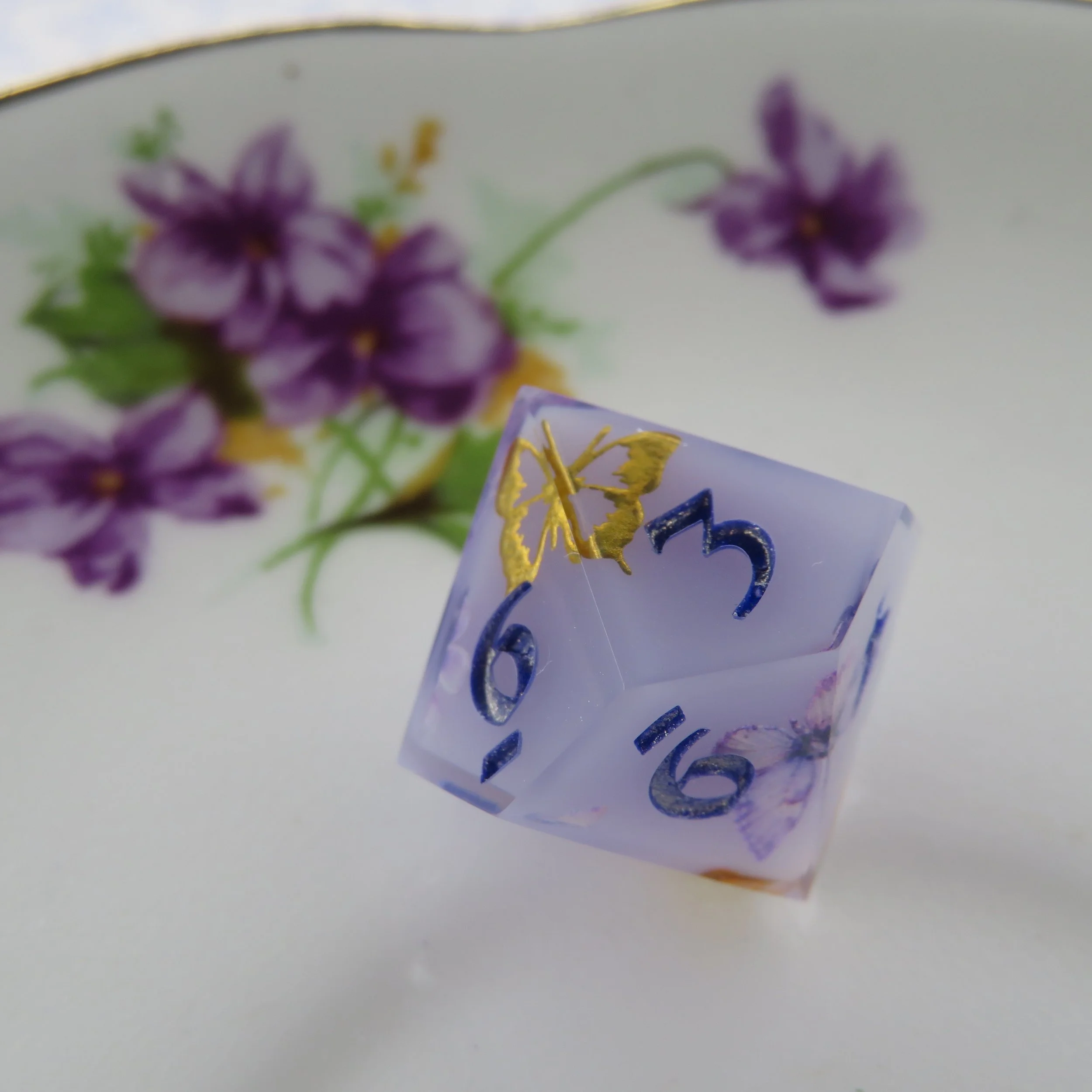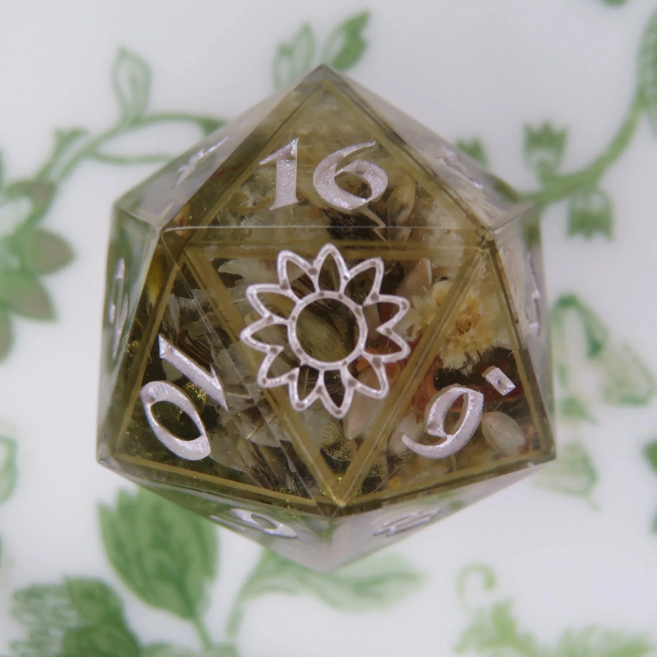 This set includes a terrarium style frame along the edges of the dice. The most common colors are gold, silver, rose gold, black and white. With the main colors you’ll get a more clean, sharp frame most of the time, however if you choose a different color, I use paint, which is more difficult to apply. I have quite a few different paint colors, so I can make any color you’d like. This style is common in basic colored dice or dice with flowers and tiny inclusions. These add-ons follow the same guidelines as their sister items.