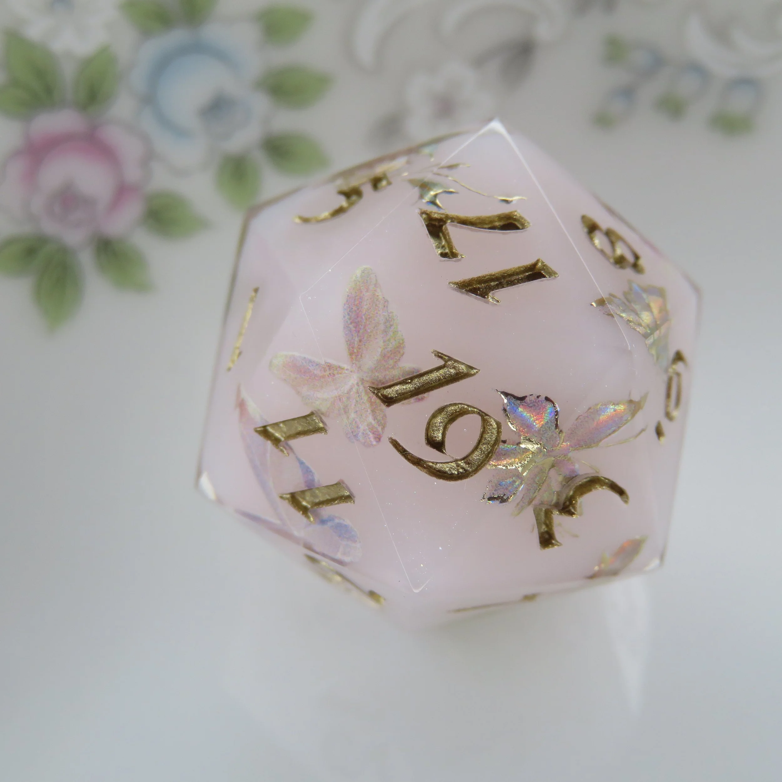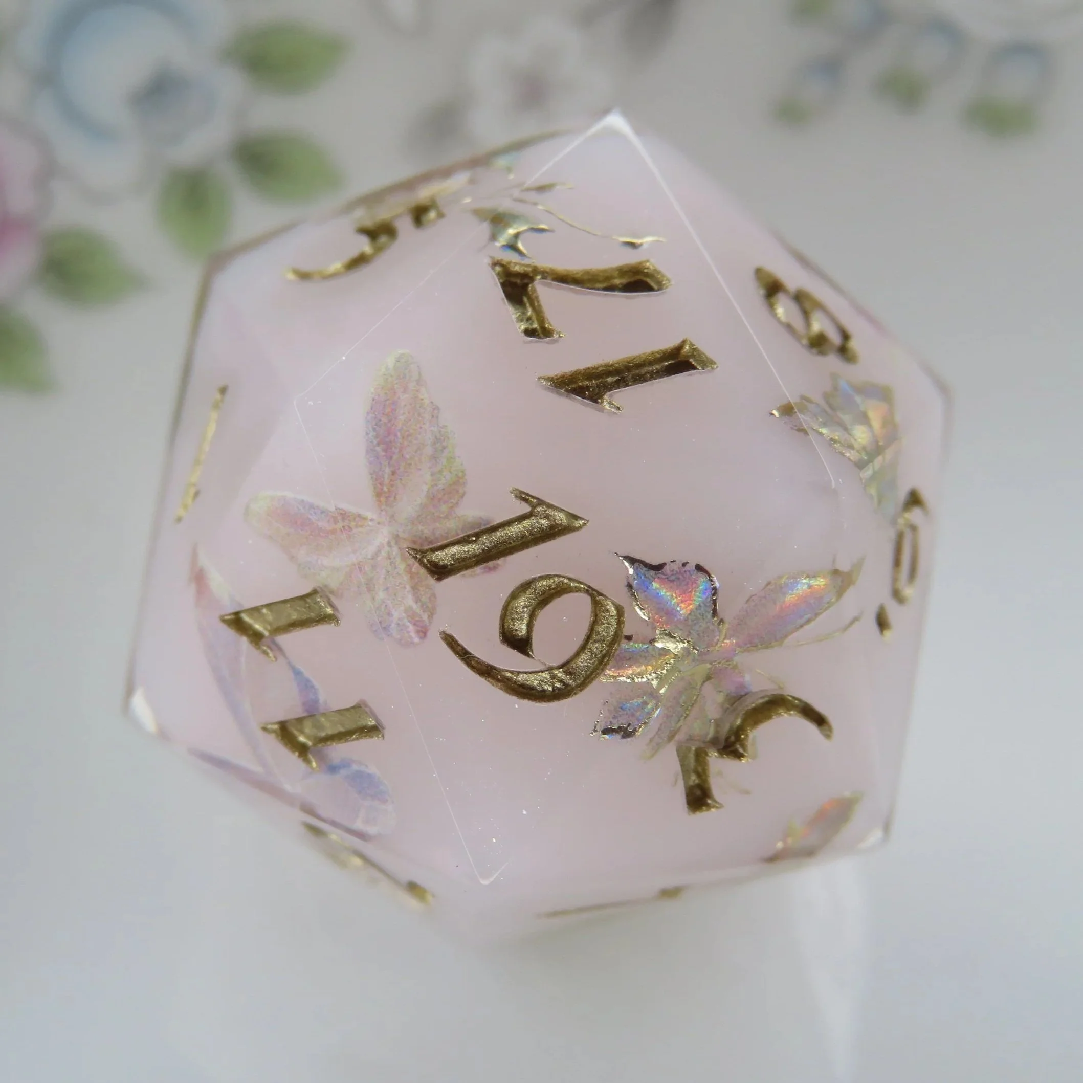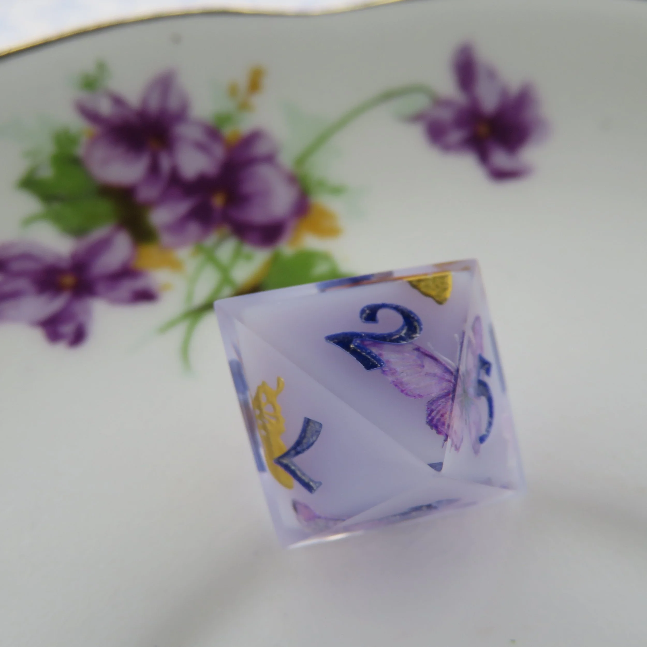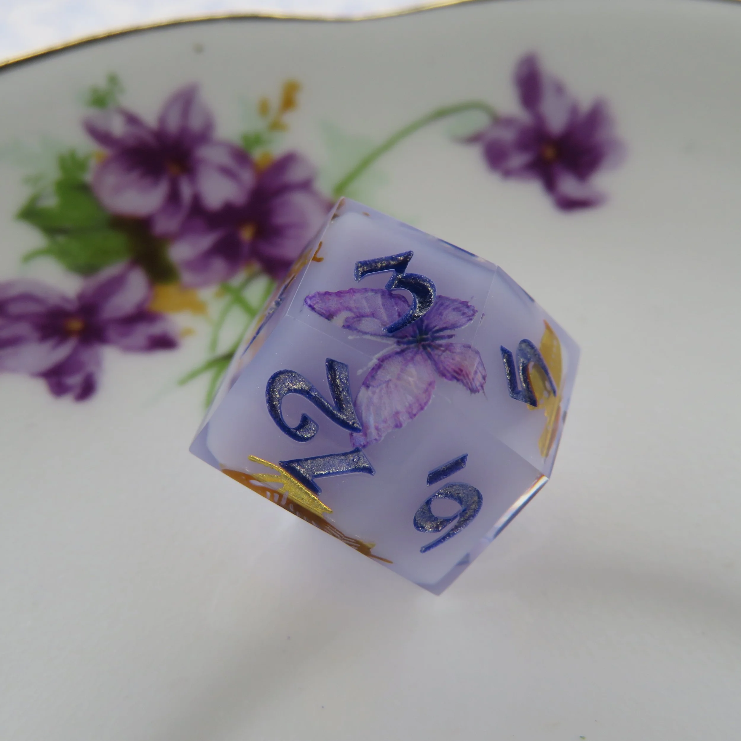 This set includes a terrarium style frame along the edges of the dice. The most common colors are gold, silver, rose gold, black and white. With the main colors you’ll get a more clean, sharp frame most of the time, however if you choose a different color, I use paint, which is more difficult to apply. I have quite a few different paint colors, so I can make any color you’d like. This style is common in basic colored dice or dice with flowers and tiny inclusions. These add-ons follow the same guidelines as their sister items.