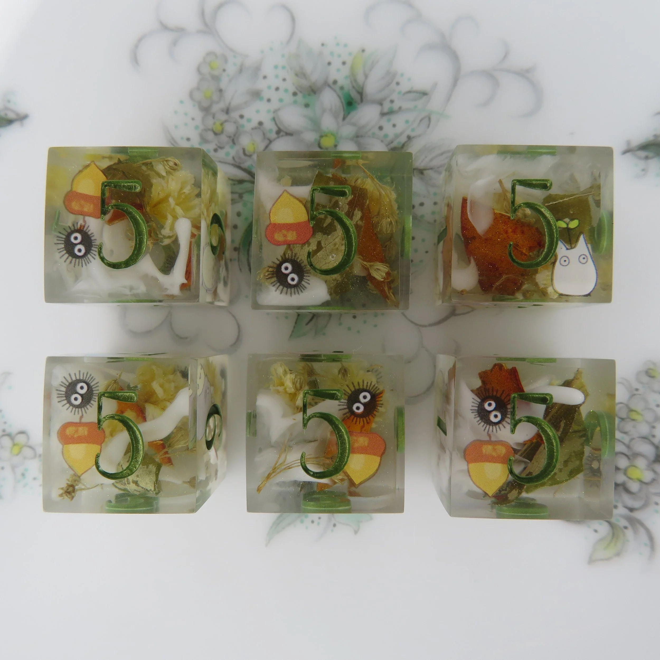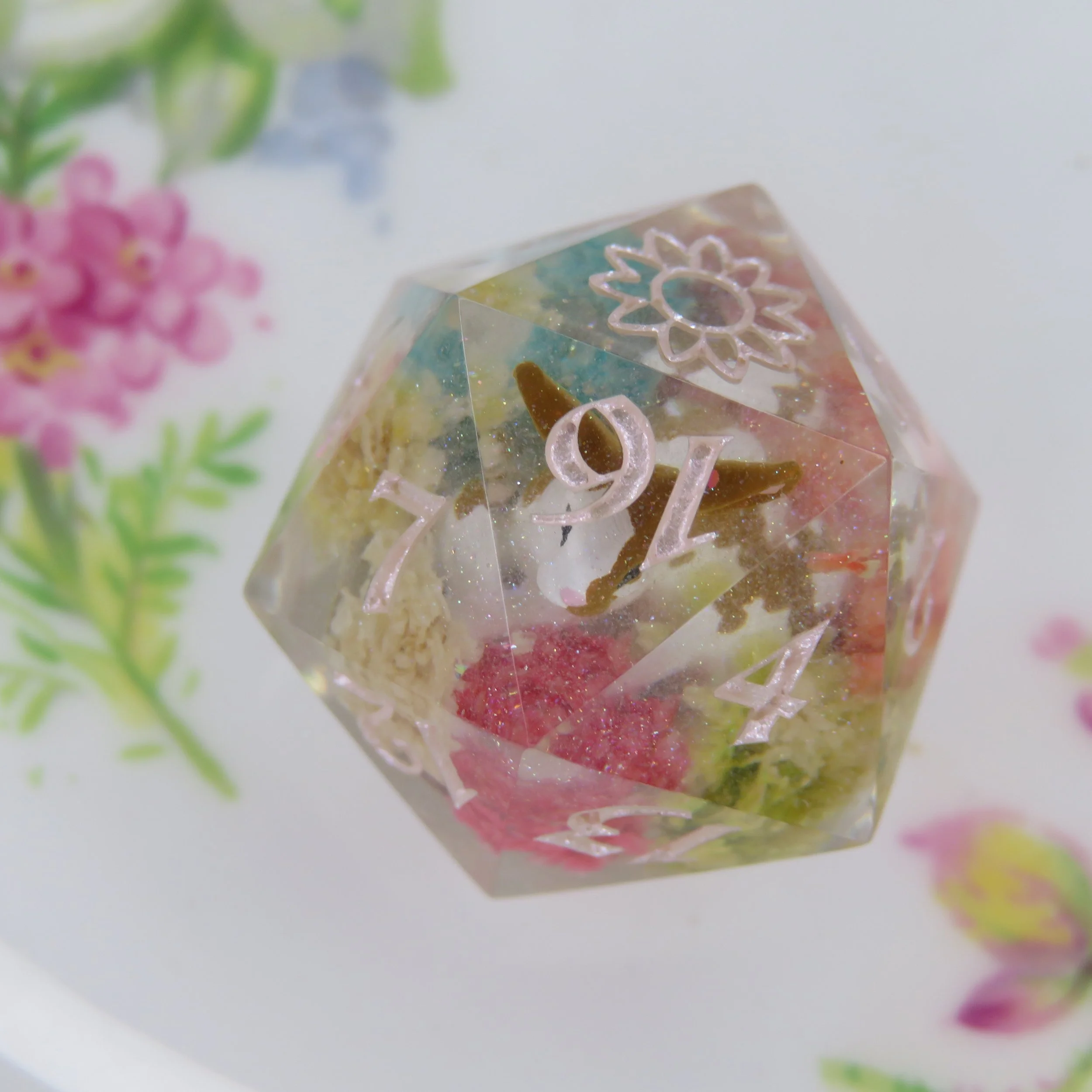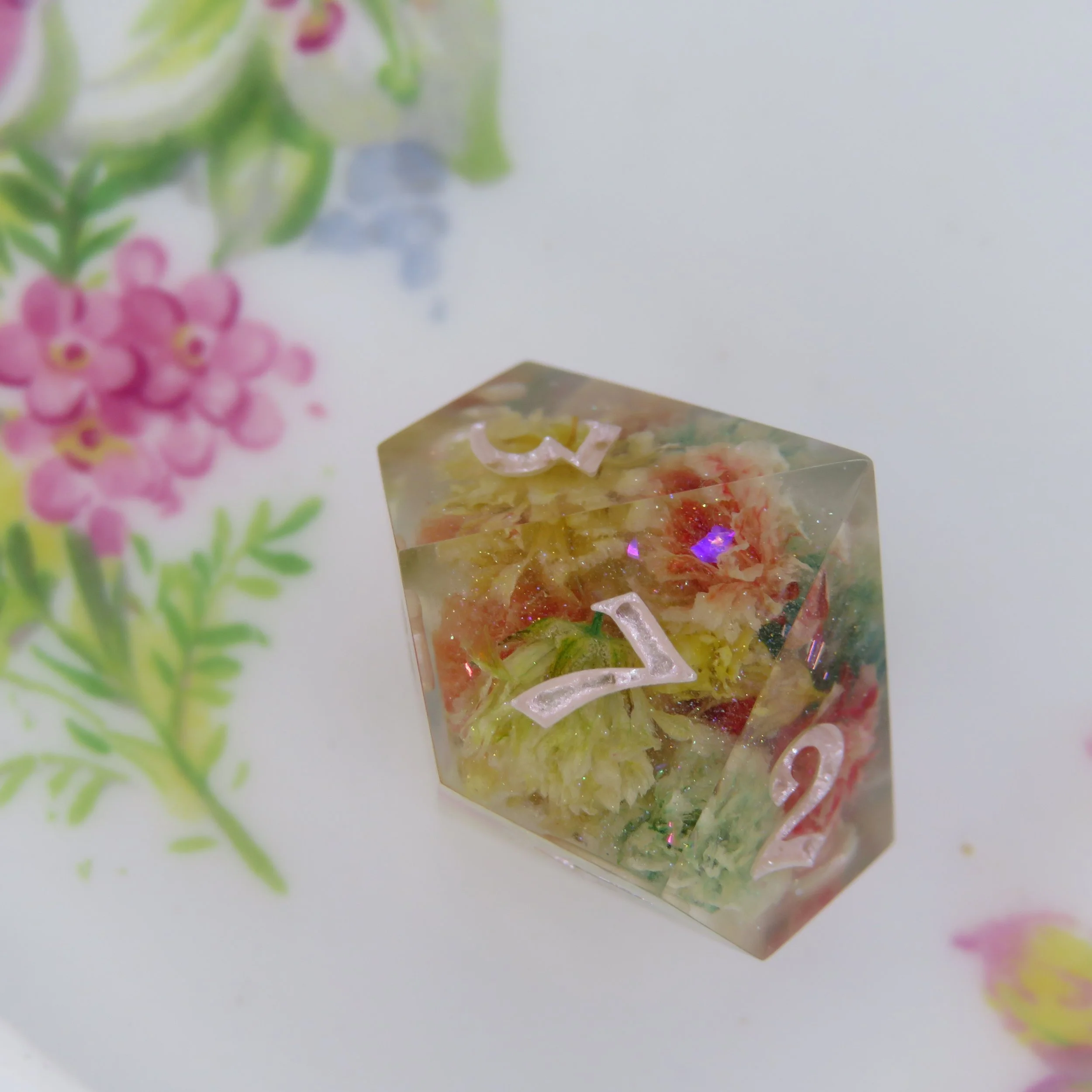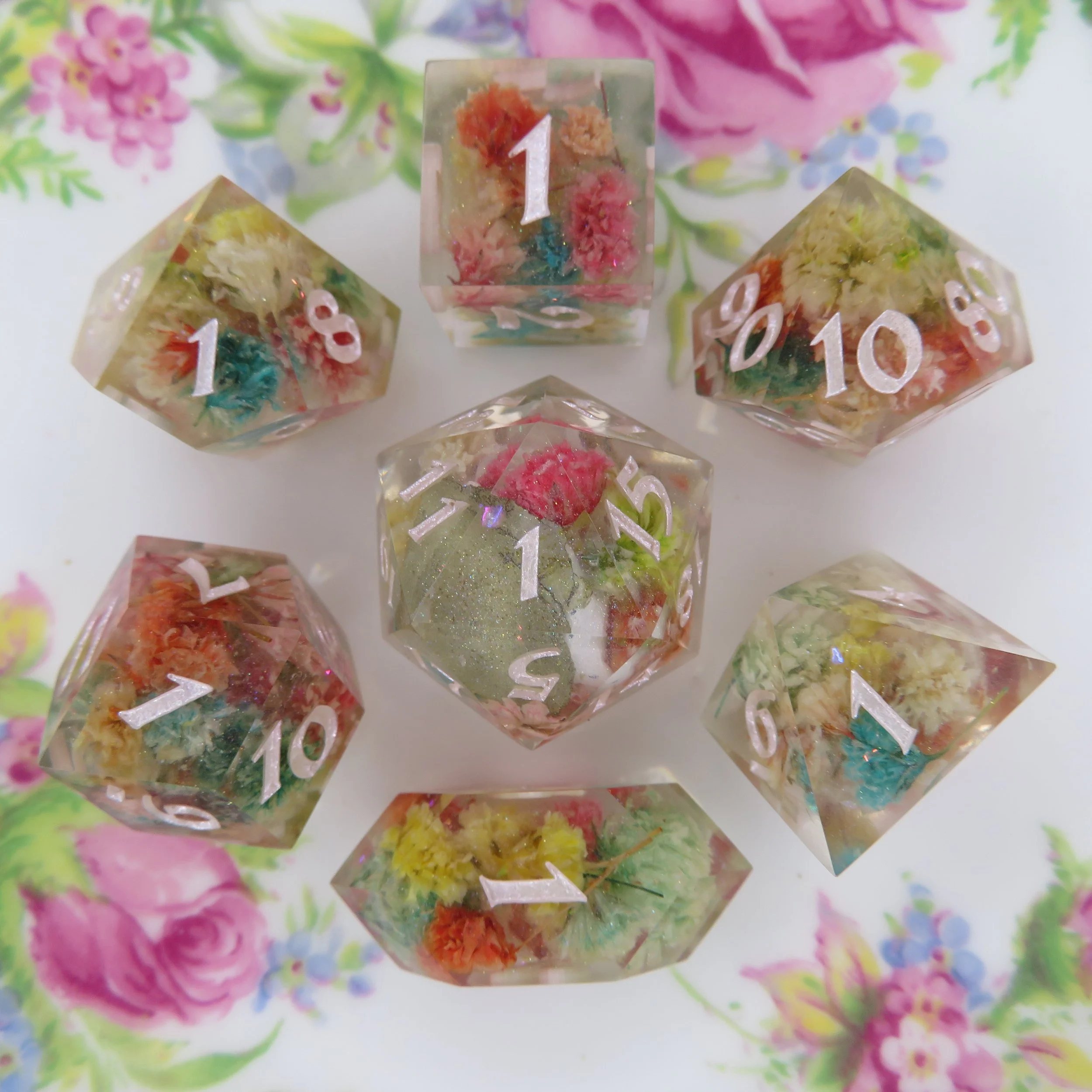 This type of dice set can also have pigments/glitters but any additional florals, stickers, or terrarium frames an an additional $10-20.