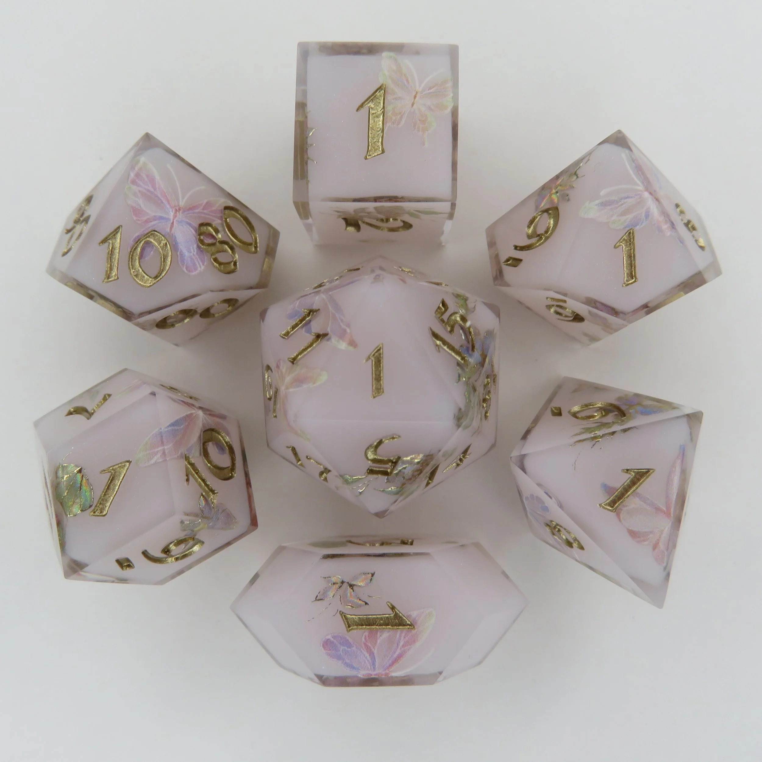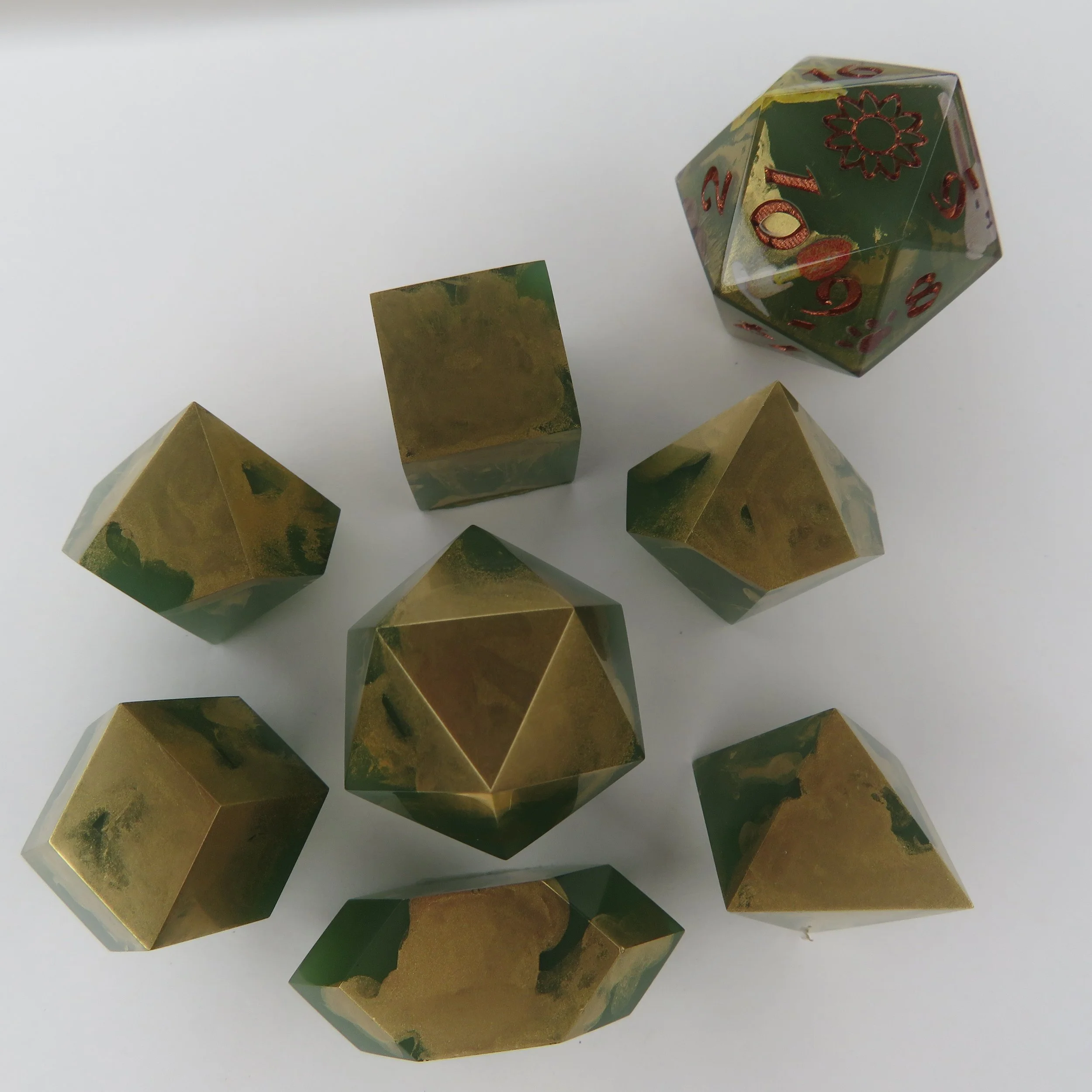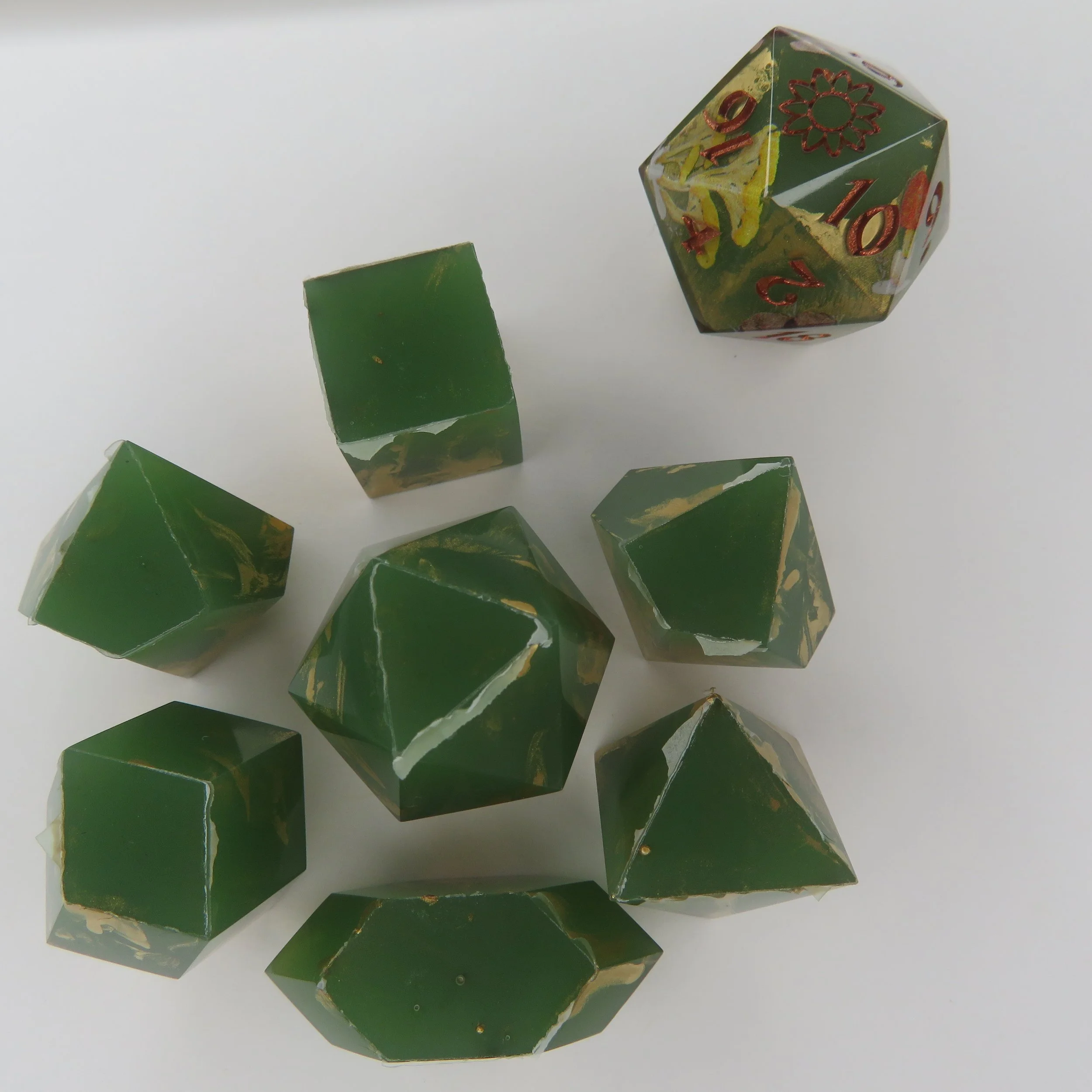 These dice are NOT 3D printed or made of polymer clay, but have said inclusions. These dice can vary in labor time by quite a lot so pricing for these dice are unavailable, but the best I can offer is $130 minimum for a standard polyhedral dice set.