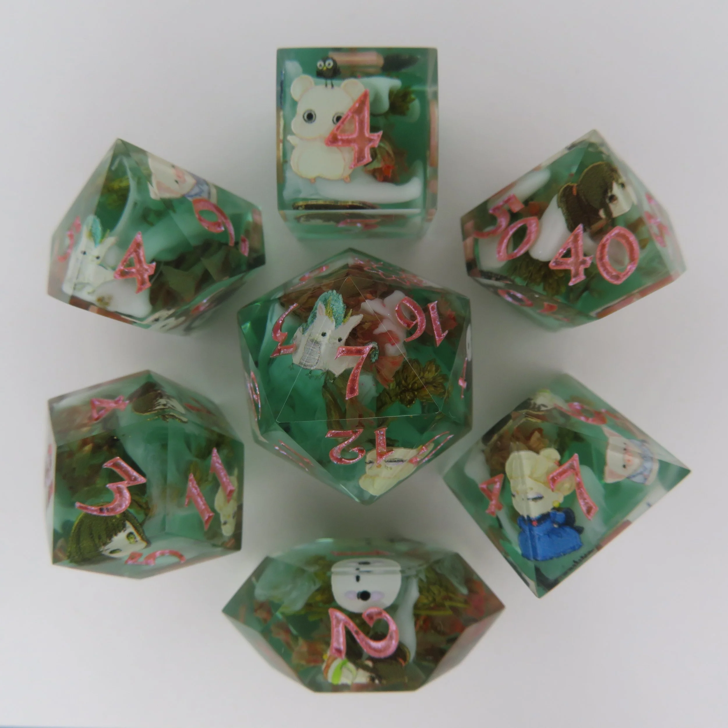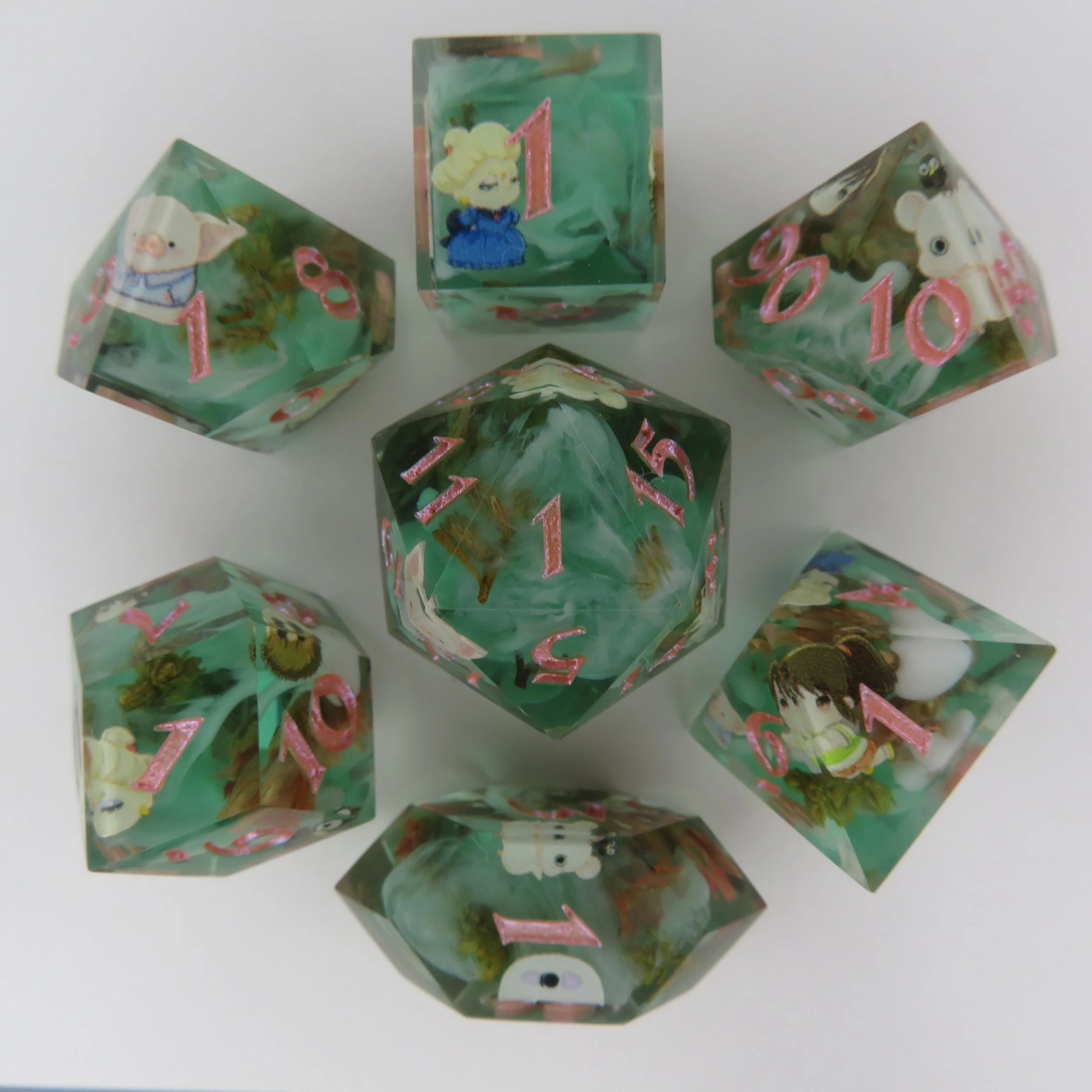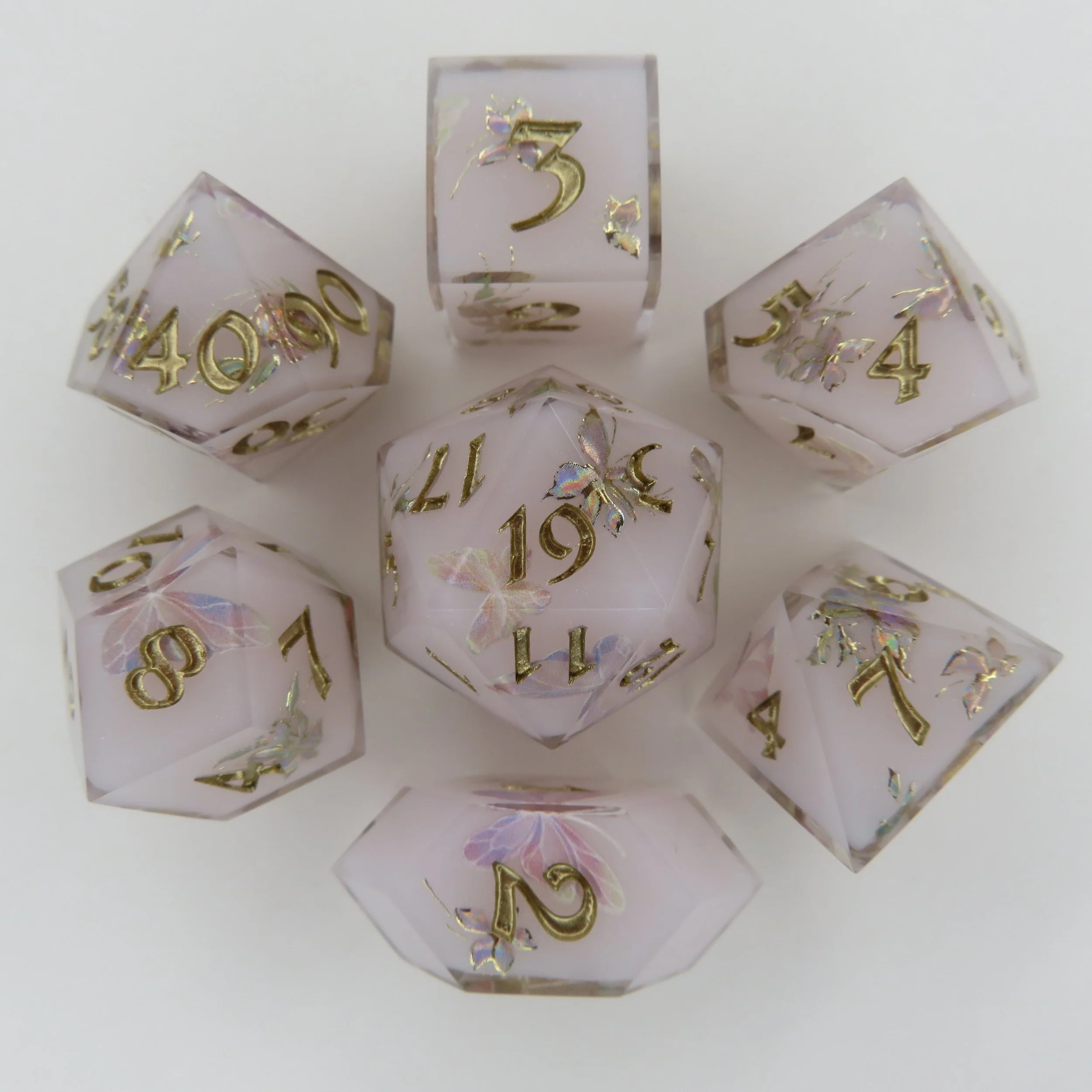 These dice are NOT 3D printed or made of polymer clay, but have said inclusions. These dice can vary in labor time by quite a lot so pricing for these dice are unavailable, but the best I can offer is $130 minimum for a standard polyhedral dice set.