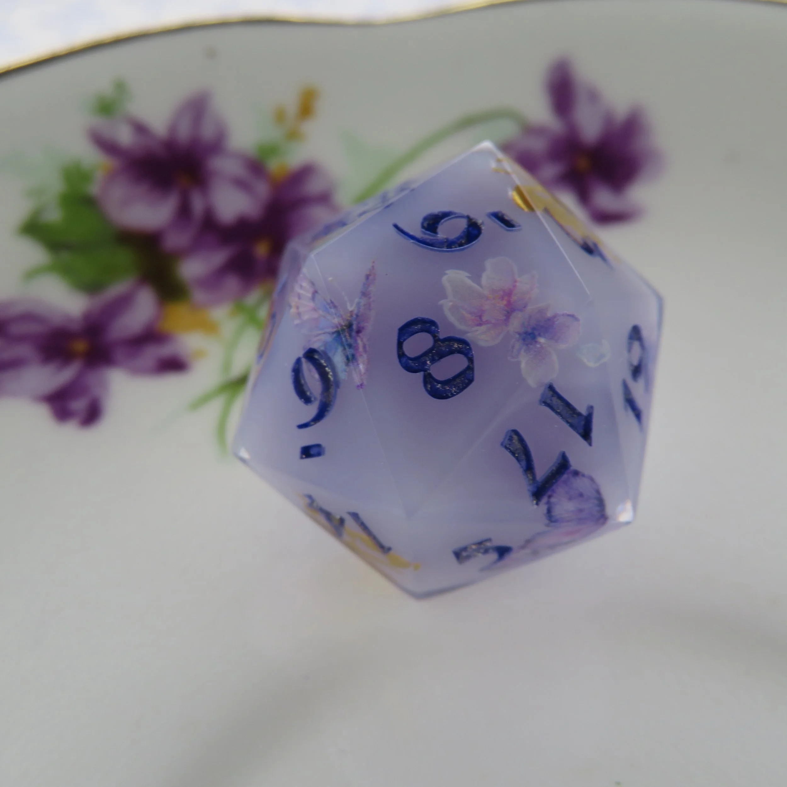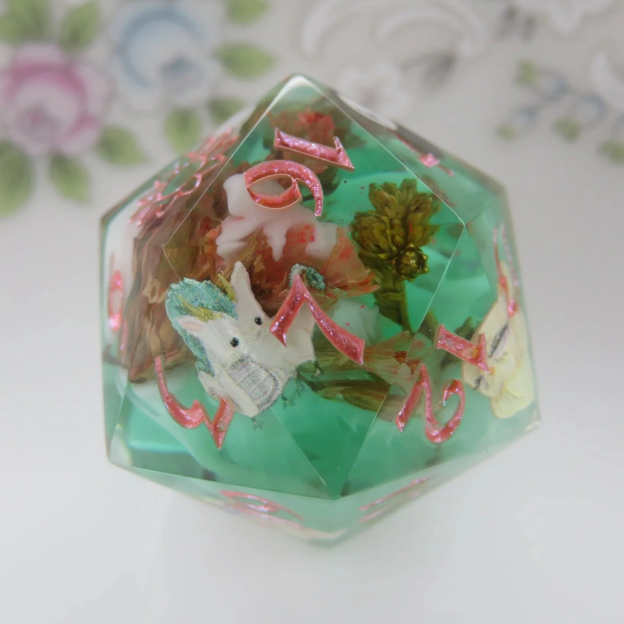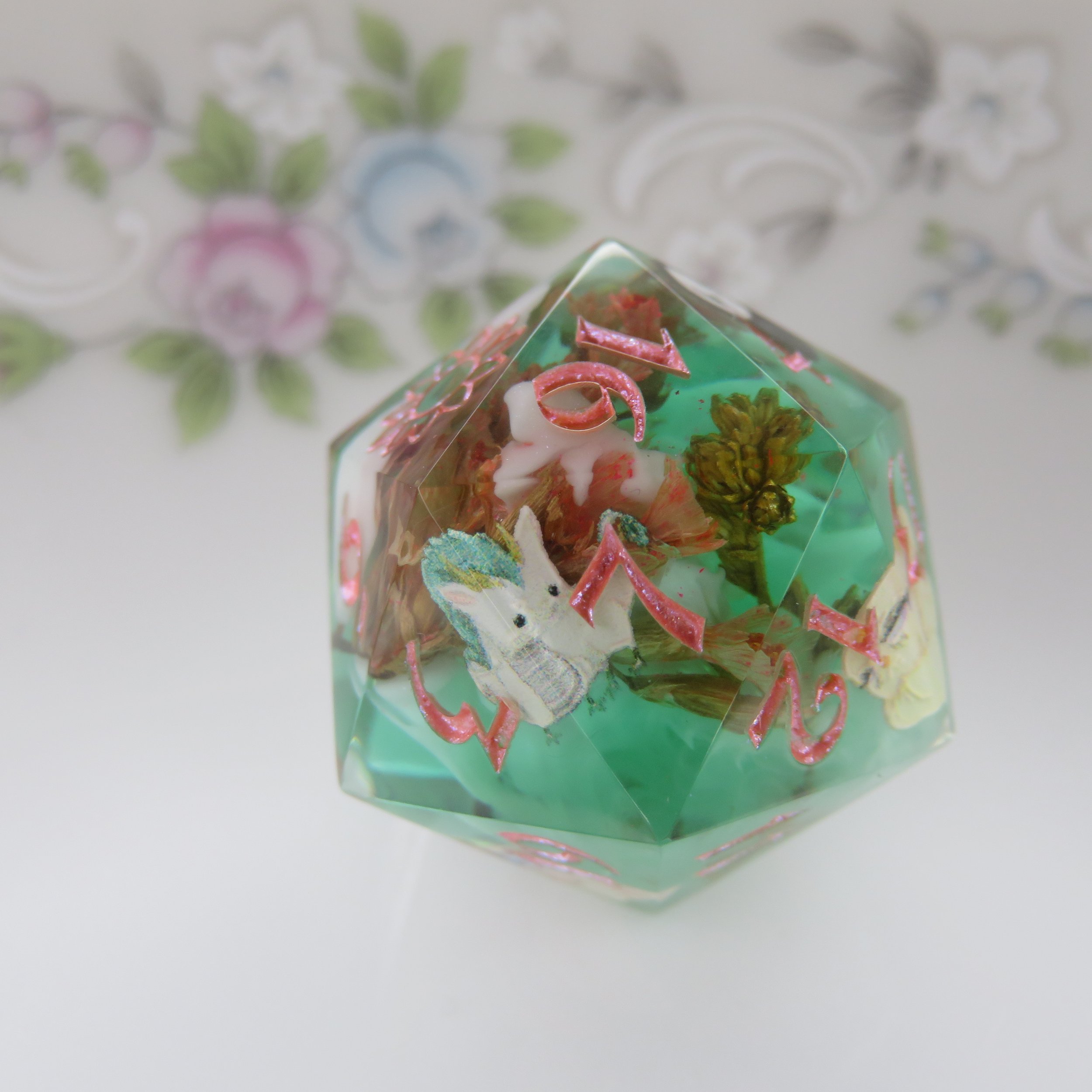 Please tell me your name, who the set is for and what type of dice set and look you are interested in or what you know you’d like included. For example: a Sticker Dice Set with bees, and pink flowers. Or a Terrarium Dice Set with real bees, blue flowers and white frames. The more detail you provide the better. You should also think about what color you’d like your numbers to be, I can do pretty much any color in matte, or sparkle/ shimmer. If you have a specific date you need it ready by, please let me know.